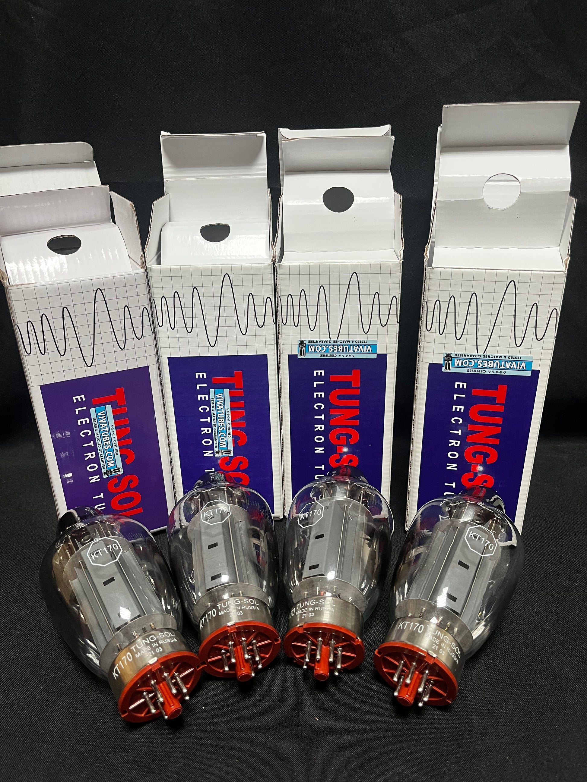 Tung-Sol KT170 Quartett – neuwertige, moderne Leistungsröhren (Strahl-Tetroden) für High-End-Röhrenverstärker. Sie zeichnen sich durch maximale Linearität und hohe Ausgangsreserve aus und sind ideal für Gegentakt- und Ultralinear-Topologien in HiFi- und Studioanwendungen.